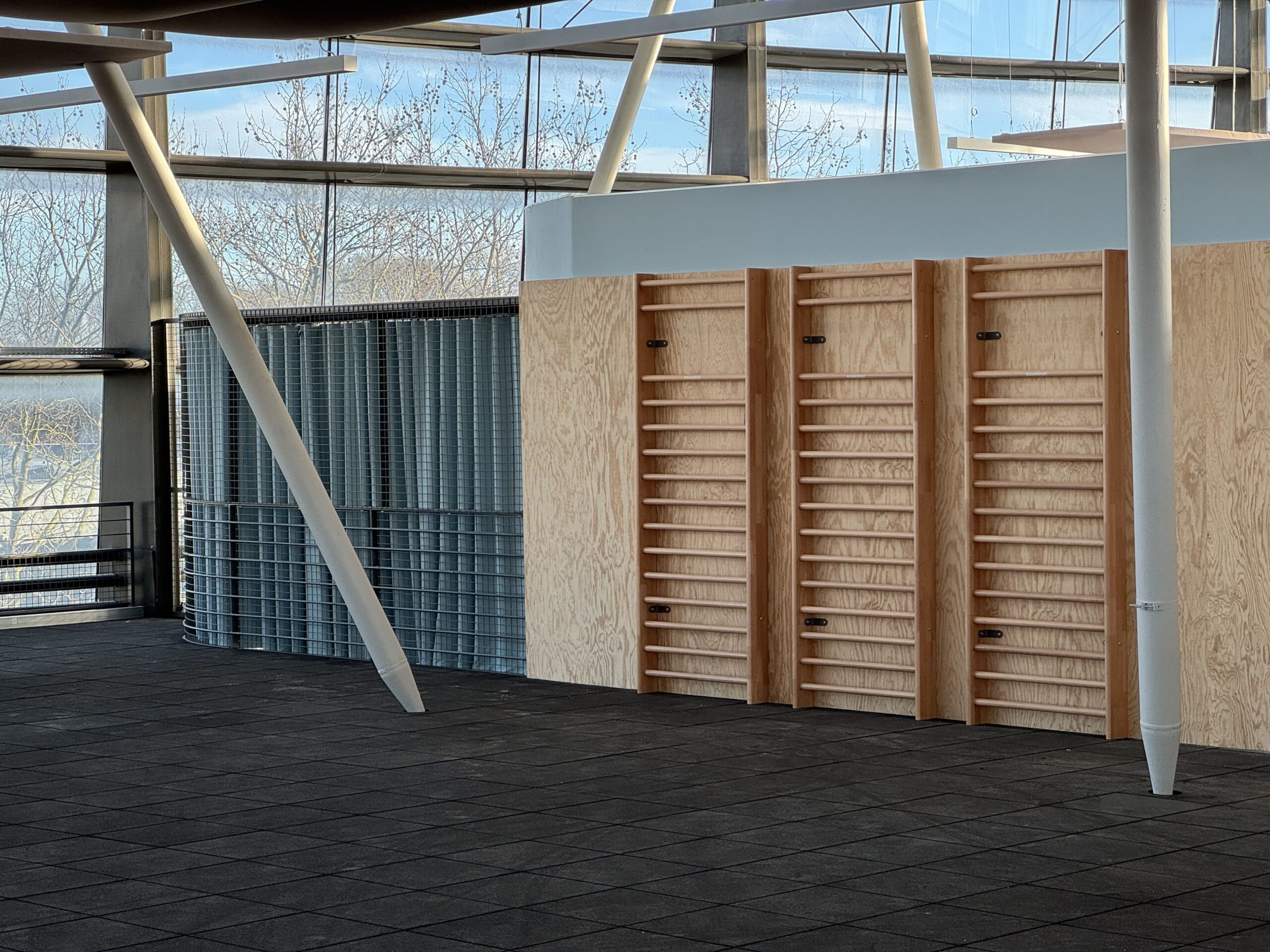 Situé sur le campus de la Cité Descartes, dans la ZAC de Champs-sur-Marne, le projet consiste à réhabiliter le deuxième niveau du bâtiment Rabelais de l’Université Gustave Eiffel pour y installer des équipements sportifs dédiés aux étudiants. Initialement, ce plateau accueillait un espace de « food-court », avant d’être transformé en bibliothèque. Le plan libre, conçu pour le programme d’origine, permet d’intégrer de nouveaux volumes programmatiques sur ce plateau de 1000 m². Les circulations, prenant la forme du négatif de ces volumes, desservent successivement un mur d’escalade, des vestiaires, une salle de musculation, une salle de boxe, un dojo, une salle de fitness et des bureaux pour le personnel. L’espace d’entre-deux, constitué par les circulations, crée une ambiance chaleureuse grâce à des parois en bois dans un grand volume lumineux. En conservant la structure initiale, l’intervention architecturale ne dénature pas les autres niveaux du bâtiment. Enfin, grâce au démontage des grilles métalliques des anciens systèmes de ventilation, il a été possible d’intégrer du mobilier en réemploi.